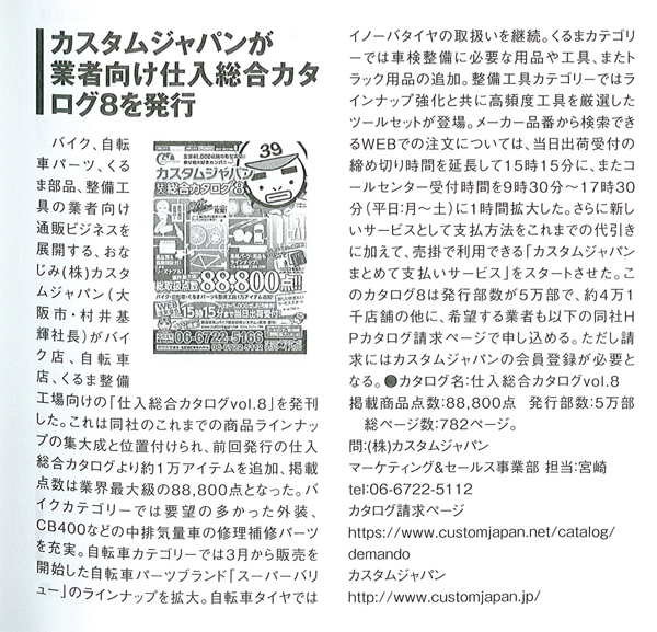 バイク、自転車パーツ、くるま部品、整備工具の業者向け通販ビジネスを展開する、おなじみ(株)カスタムジャパン(大阪市・村井基輝社長)がバイク店、自転車店、くるま整備工場向けの「仕入れ総合カタログvol.8」を発刊した。これは同社のこれまでの商品ラインナップの集大成と位置付けられ、前回発行の仕入総合カタログより約1万アイテムを追加、掲載点数は業界最大級の88,800点となった。